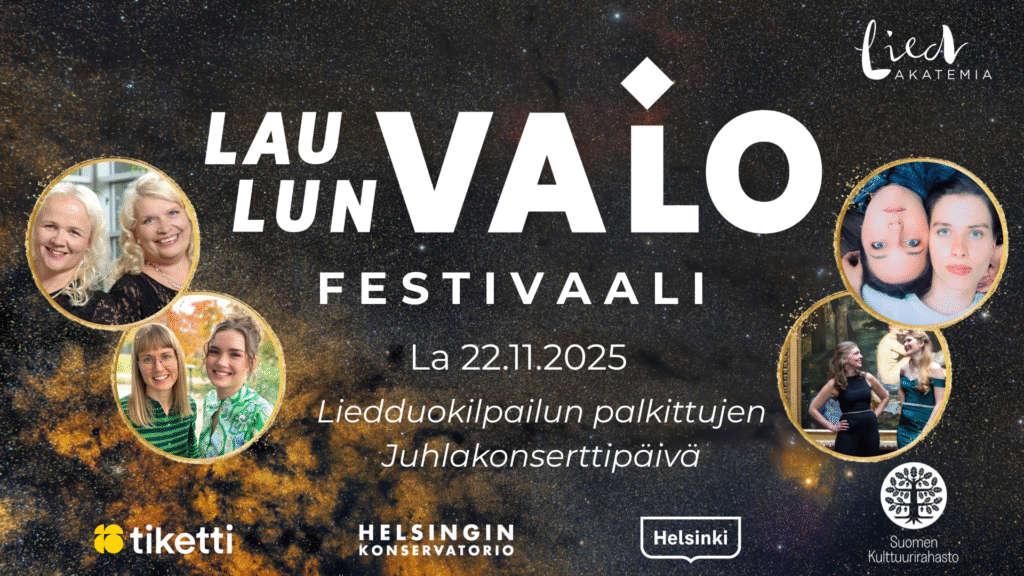Ensimmäistä kertaa järjestämämme Laulun Valo -liedkilpailu jo valmistuneille ja ammatissa toimiville liedduoille vastaanotti 24 erittäin mielenkiintoista ja uudella tavalla liedkonserttitraditiota käsittelevää konserttisuunnitelmaa. Hakemuksia saapui ympäri Suomen ja ulkomailta asti, ja hakijoiden ikäjakauma oli ilahduttavan laaja. Tuomaristo valitsi tästä joukosta neljä hienoa ja keskenään todella erilaista kokonaisuutta esitettäväksi Laulun Valo -festivaalin juhlakonsertissa Helsingin konservatorion konserttisalissa lauantaina 22.11.2025.