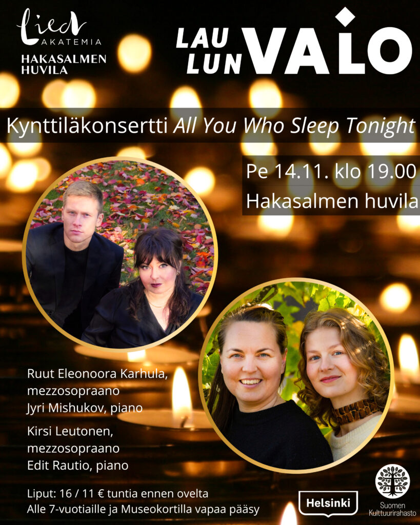 Iltahämärässä kaupungin kiihkeä syke terävöityy: siinä soivat tuhannet tarinat. Kynttiläkonsertti All You Who Sleep Tonight kokoaa kuulijansa urbaanin yön hetkien äärelle Hakasalmen huvilan saliin.