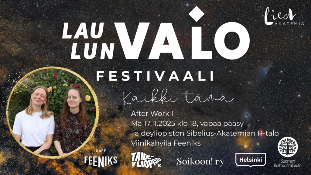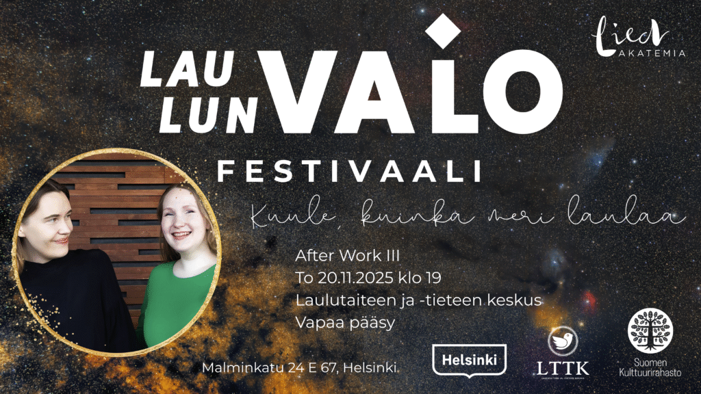 Laulun Valo -festivaalin ensimmäisessä After Work -sarjan konsertissa maanantaina 17.11. klo 18, ilmaisuvoimastaan ja äänensä hopeareunasta ylistetty sopraano Stella Tähtinen ja Berliinissä Universität der Künste -yliopistossa korrepetiittorina ja säestäjänä työskentelevä pianisti Tanja Niiranen avaavat Laulun Valo After Work -sarjan Maleena Linjaman, Claude Debussyn, Kaija Saariahon, Jean Sibeliuksen, Samuel Barberin ja Undine Smith Moorin teoksilla.