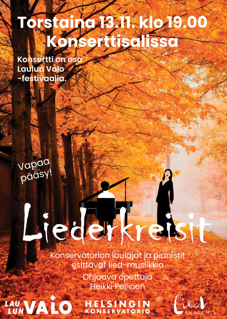 Liedseminaarin syyssatoa. Helsingin Konservatorion laulajat ja pianistit esiintyvät ja esittävät syksyn liedseminaarissa opiskeltua lied-musiikkia. Mm. Schubert, Schumann, Brahms, Melartin, Sibelius, O. Merikanto, Tšaikovski. Ohjaava opettaja Heikki Pellinen. Vapaa pääsy.